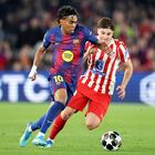 La expulsión de Cubarsí condiciona un partido en el que la generosidad futbolística azulgrana contrasta con el oficio de un Atlético avalado por los excelentes goles de Julián Alvarez y Sorloth